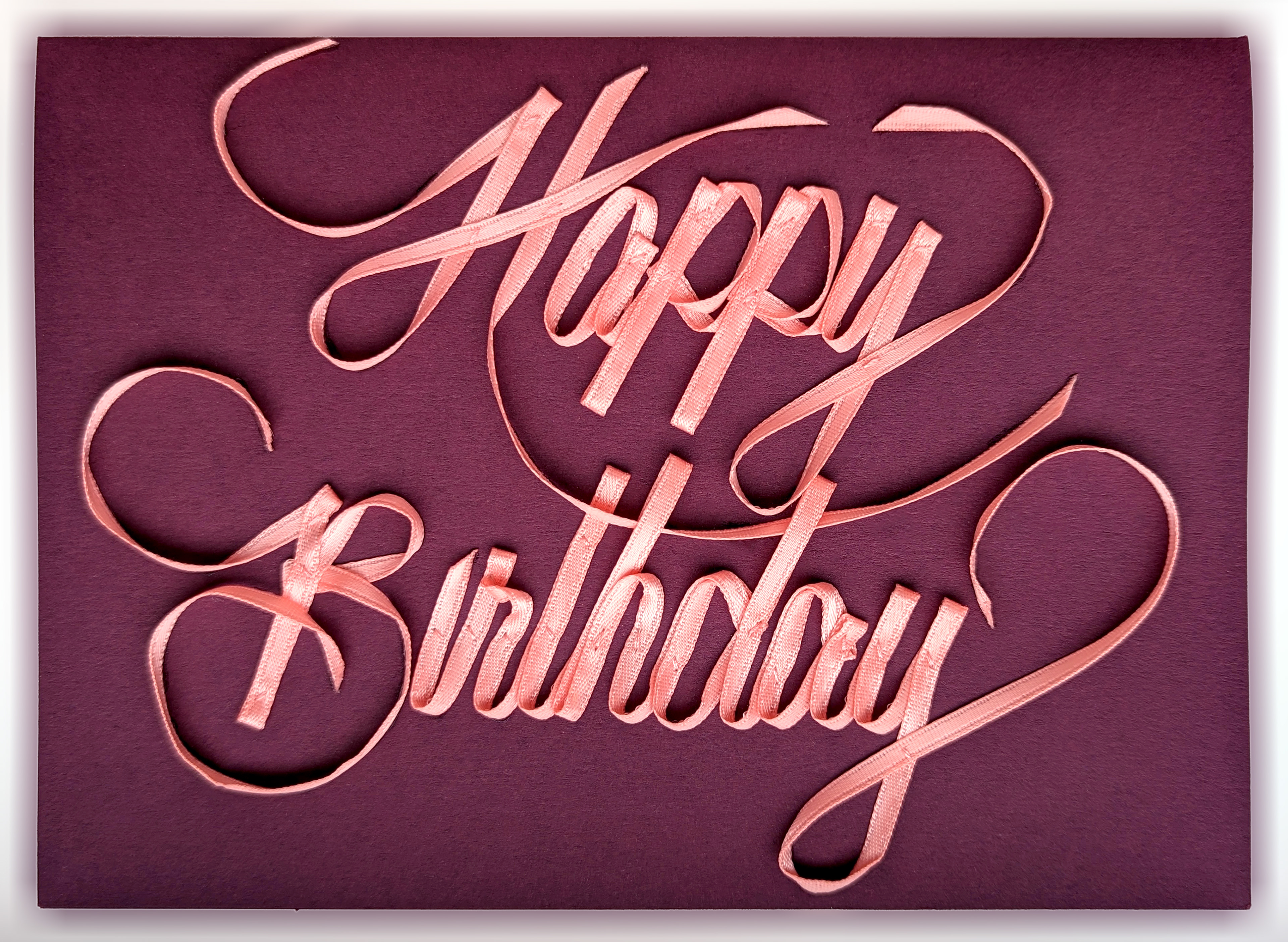 I love calligraphy and I enjoy sewing small projects. These letters were hand-sewn onto cardstock, with a bit of glue to attach the curled letter tips.