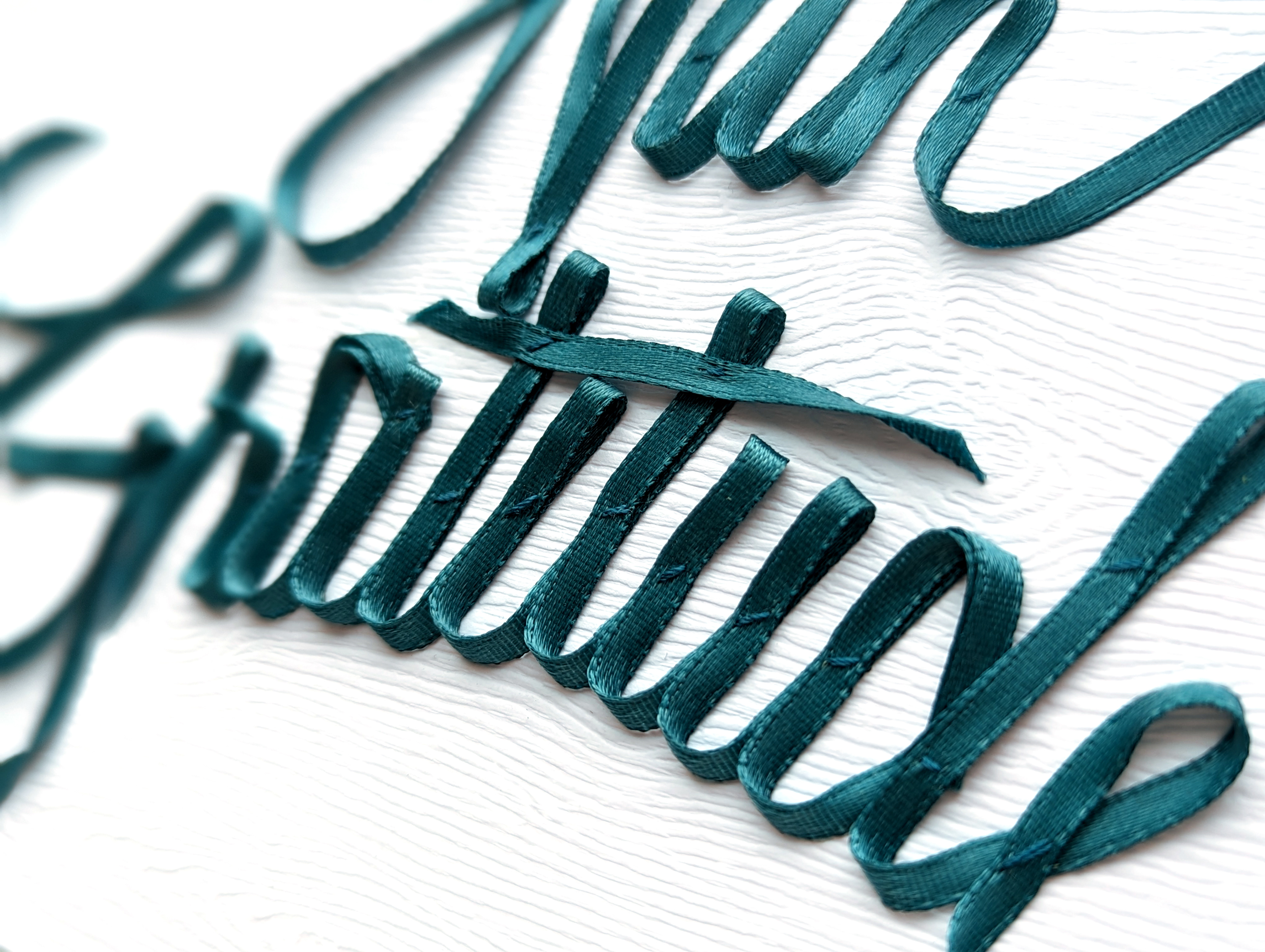 I love calligraphy and I enjoy sewing small projects. These letters were hand-sewn onto cardstock, with a bit of glue to attach the curled letter tips.